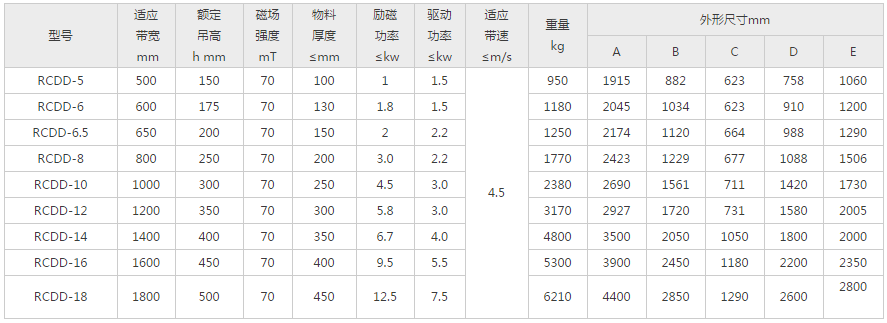 RCDD型電磁自卸式榴莲视频毛片是一種用於自動粉狀或塊狀非磁性物料中雜鐵的除鐵裝置。其內部采用電工專用樹脂澆注,自冷式全密封結構。具有透磁大、吸力強、防塵、防雨、耐腐蝕、皮帶可自動糾偏等優點,在惡劣的環境中仍能可靠運行。