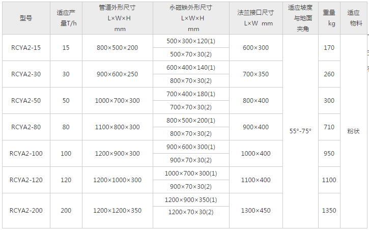 RCYA型傾斜管道式永磁榴莲视频毛片分為RCYAl、RCYA2兩種,包括無磁管道和永磁鐵兩部分,專用於封閉管道內非磁性物料的除鐵,永磁除鐵器內部采用高性能強磁材料組成複合磁係。具有體積小、磁力大、重量輕、除鐵幹淨、方便、低能耗、使用壽命長等特點。
